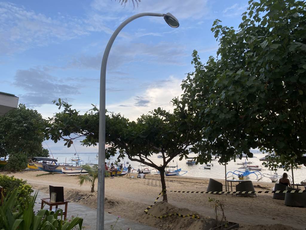 Es war nun der richtige Zeitpunkt das Resort zu erkunden. Durch eine doch sehr schöne Anlage ging es zunächst Richtung Strand. Der sah auf den Hotelfotos wirklich paradiesisch aus. Bis wir in eine Baustelle stolperten. Vor dem Hotel wurde gerade der die „Promenade“ neu gepflastert. Wir mussten die Kinderwagen durch den Sand schieben, um überhaupt in die Nähe des Strandes zu kommen. Vorbei an Flatterband der Baustelle. Um dann zu sehen, dass wir nicht an einem Traumstrand den Rest unseres Bali-Urlaubs verbringen sollten, sondern einem Hafen. Also natürlich gab es Sandstrand, aber dutzende Bote legten dort an und es lag stetig der Duft von Benzin in der Luft. Außerdem lag überall Müll herum. Der Strand war kein „privater“ Hotelstrand und wurde nicht gepflegt. Ich konnte meiner Frau anmerken, dass all die Erholung der letzten Tage plötzlich verflogen war. In dem Moment war klar, dass wir hier wieder weg müssen.