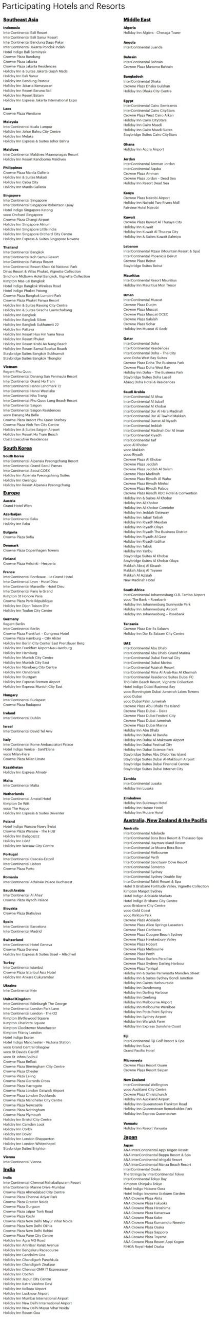 • Teilnehmende Hotel Marken: Regent, InterContinental, Vignette Collection, Kimpton, Hotel Indigo, voco, Crowne Plaza, Holiday Inn, Holiday Inn Express, Holiday Inn & Suites, Holiday Inn Express & Suites, Staybridge Suites Hotels und Resorts. Alle teilnehmeden Hotels findet Ihr am Ende des Artikels
