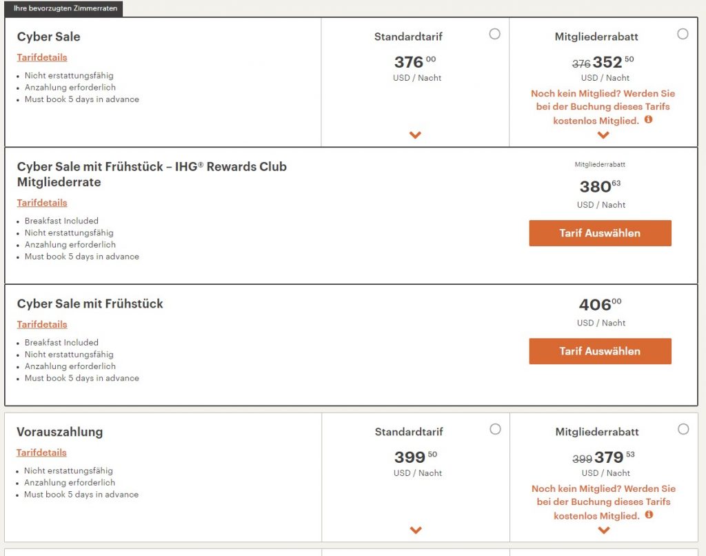 Alternativ könnt Ihr auch über die IHG App buchen. Wichtig ist, dass Ihr euch bei der Buchung für die Ratenoptionen „Cyber Sale“, „Cyber Sale mit Frühstück – Mitgliederrate“ oder „Cyber Sale mit Frühstück“ entscheidet. Ob die Raten verfügbar sind, wird Euch schon bei der Hotel-Auswahl mit einem orangefarbenem Rahmen angezeigt.