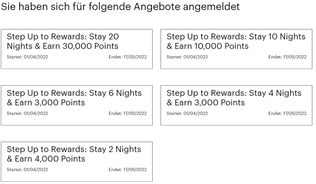 Weitere Punkte könnt Ihr Euch mit Euren Aufenthalten sichern, wenn Ihr „Punkte Pakete“ bucht oder an aktuellen Promotions teilnehmt. Punkte-Pakete werden Euch bei der Online-Buchung entweder als separater Tarif oder als zubuchbare Leistung angeboten. Ihr zahlt dann einfach etwas mehr und bekommt mehr Punkte gutgeschrieben. Alle für Euch verfügbaren oder freigeschalteten Promotions findet Ihr in einem speziellen Bereich in Eurem Konto unter „Angebote„.