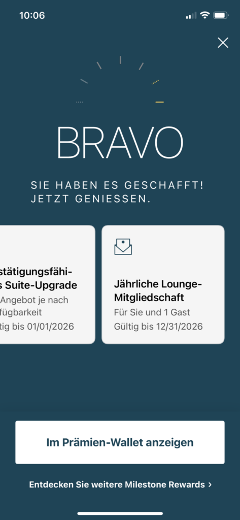 Aber es gibt auch gute Nachrichten: Habt Ihr Euch im vergangenen Jahr auf die Loungemitgliedschaft vorbereitet und löst den Meilenstein dafür jetzt noch ein, ist der Loungezugang bis zum 31. Dezember 2026 gültig. Also noch einmal für knapp zwei Jahre.
