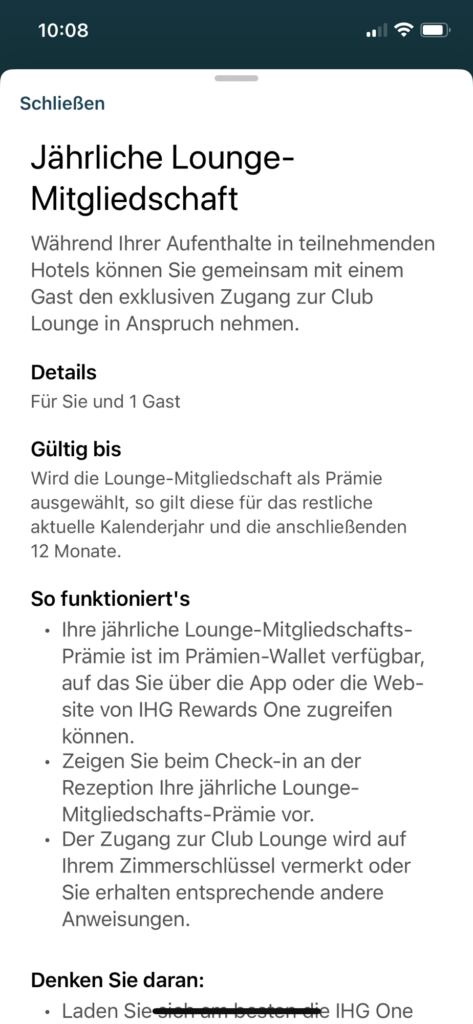 Genau dabei gab es einen kleinen Hack, wie ich mir und viele Andere den Zugang zu den Lounges für ganze zwei Jahre sicherte. Die Regel der Milestone-Rewards besagen, dass nach Erreichen des Ziels, man drei Monate Zeit hat, sich den Vorteil auszuwählen. Gleichzeitig galt die Loungemitgliedschaft für den Rest des Kalenderjahres, in dem sie aktiviert wurde, plus dem gesamten folgenden Jahr. Wenn man nun die 40. oder 70. Übernachtung nach dem 1. Oktober abschloss, konnte man die Wahl des Loungevorteils ins neue Jahr verschieben und sich zwei Jahre lang Zugang zu den Club Lounges sichern.