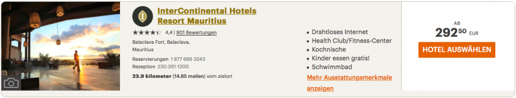 Das InterContinental Mauritius, das ich für einen Urlaub in Betracht gezogen habe, hätte mich 292,50 Euro pro Nacht gekostet. Alternativ kann man das Hotel auch für 30.000 Punkte buchen, die man dank dieser Aktion für 132 Euro kaufen kann. Man spart also 50% des Zimmerpreises.