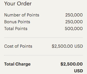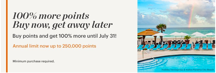 Derzeit gibt es ein Angebot, bei dem man bis zu 100% der gekauften IHG Punkte als Bonus geschenkt bekommt. Dabei gibt es diesmal keine wirkliche Staffel für den Preis der Punkte. Bereits ab 5.000 gekaufte Punkte erhält man 100% Punkte geschenkt. Die 100% Bonus Punkte erhaltet Ihr, wenn Ihr mindestens 5.000 IHG Punkte kauft. Maximal könnt Ihr bei dieser Aktion 250.000 IHG Punkte kaufen und erhaltet anschließend 250.000 IHG Punkte als Bonus. Der Preis für diese 500.000 IHG Punkte liegt bei 2.500 US$, also etwa 2.205 Euro oder 4,41 Euro pro 1.000 IHG Punkte.