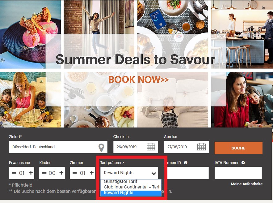 Reward Nights lassen sich ganz normal über die Suche auf IHG.com finden. Dafür einfach als Tarifpräferenz „Reward Nights“ einstellen.