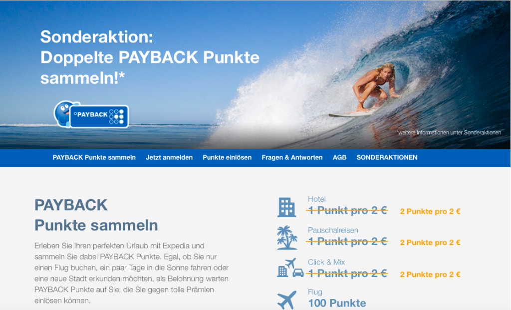 Normalerweise bekommt Ihr bei Expedia 1 Payback Punkt pro 2 Euro Umsatz. Eine Ausnahme sind dabei reine Flugbuchungen mit Pauschalen von 100 Punkten pro Buchung. Im Juli erhaltet Ihr jedoch auf die Buchung von Hotels, Pauschalreisen und Click&Mix, also die gleichzeitige Buchung von Flug und Hotel, die doppelte Payback Punkte Anzahl gutgeschrieben. Also pro Euro ein Punkt.