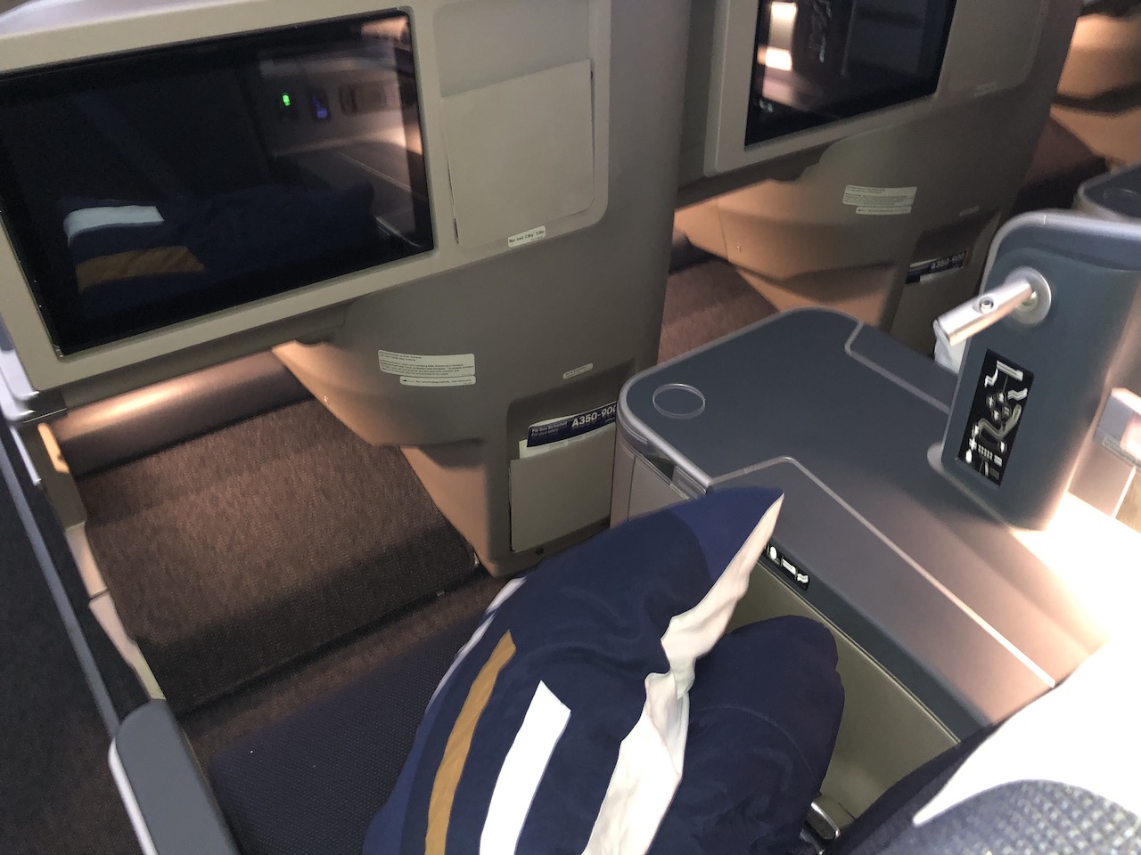 Gefühlt bietet der Sitz in der Bettfunktion etwas mehr Liegefläche. Der direkte Gangzugang ist nicht nur auf Nachtflügen ein riesiger Vorteil. Auch hier sind die Waschräume etwas anders angeordnet und ausgestattet.