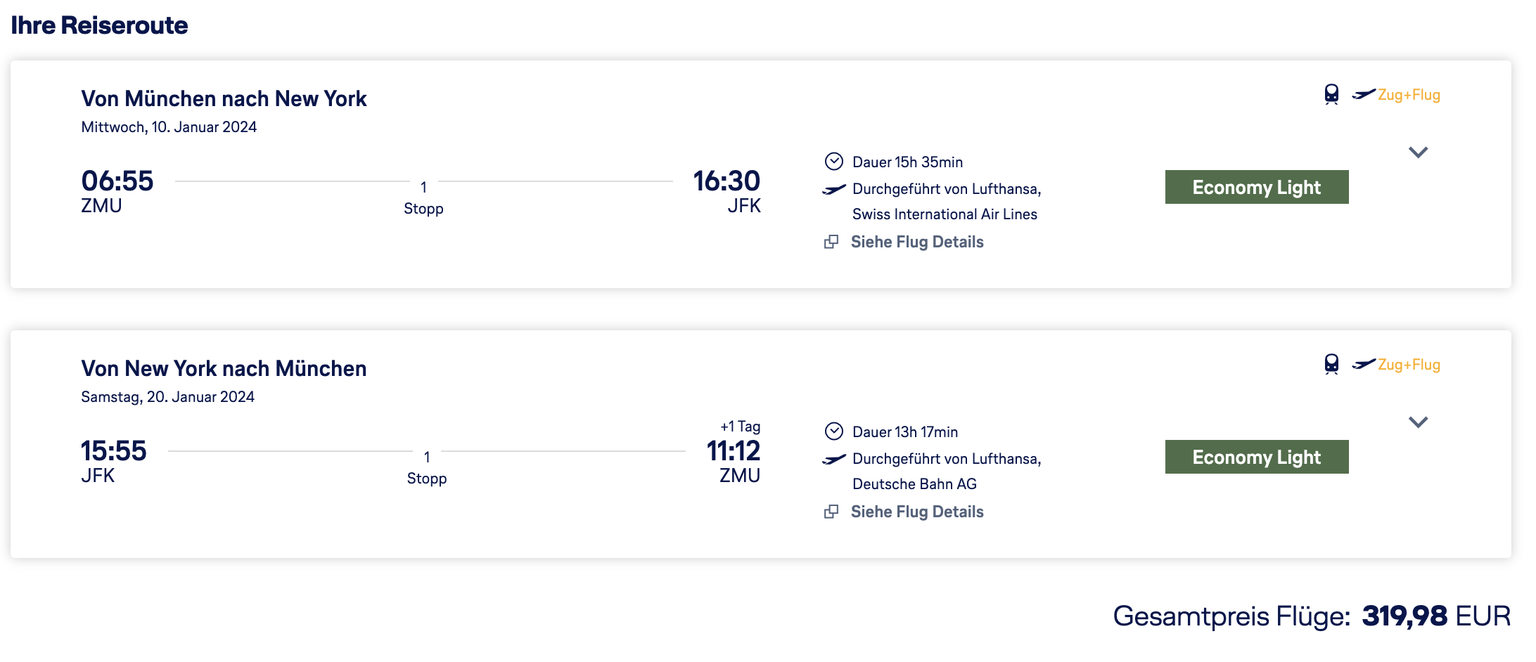 Wer jetzt „ZMU“ als Startflughafen auf der Homepage von Lufthansa eingibt, erhält Verbindungen die am Hauptbahnhof der bayerischen Landeshauptstadt starten. Die Flüge nach New York sind für den Zeitraum ab Januar bis April 2024 vereinzelt besonders günstig zu haben.