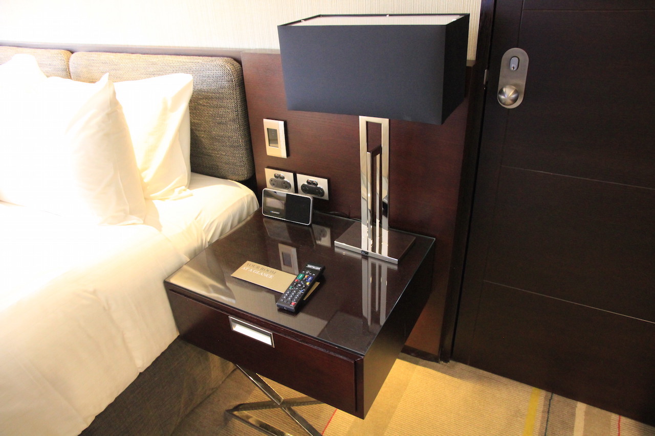 Auf jeder Seite befindet sich ein Nachtisch mit Steckdosen und Nachttischlampen. Zudem befindet sich auf der rechten Seite ein Kontroller mit dem man die meisten Funktionen im Raum (Licht, Vorhänge, Klimaanlage)kontrollieren und einstellen kann.