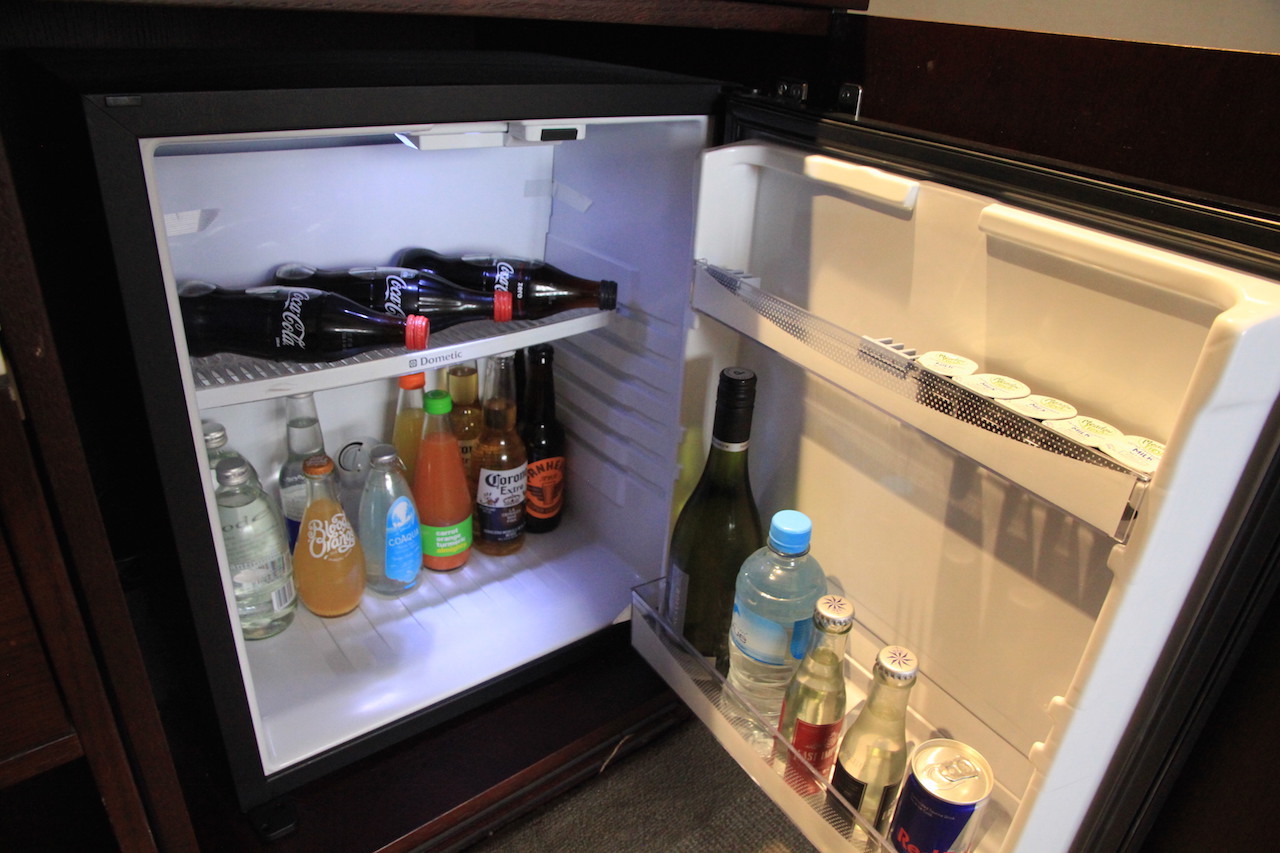Rechts neben dem Bett befindet sich eine Schrank/Kommodenkonstellation. In der Ecke befindet sich ein großer Kleiderschrank . Daneben, also unterhalb vom badezimmerfenster befindet sich die Ablage für die Koffer. Die Minibar und ein Regal mit Gläsern gehört als weiteres Element dazu.
