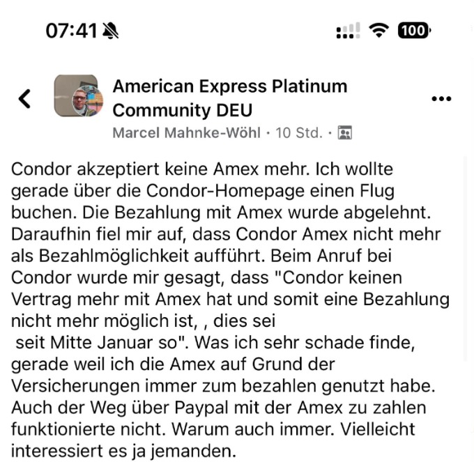 Ein Social Media-Nutzer berichtete gerade via Facebook, dass bei einer Flugbuchung seine Zahlung per Amex abgelehnt wurde. Er wendete sich an den Condor Customer Service und der bestätigte tatsächlich, dass „Condor keinen Vertrag mehr mit Amex“ habe und „seit Mitte Januar“ keine Zahlungen mehr über die beliebte Reisekreditkarte mehr möglich sei.
