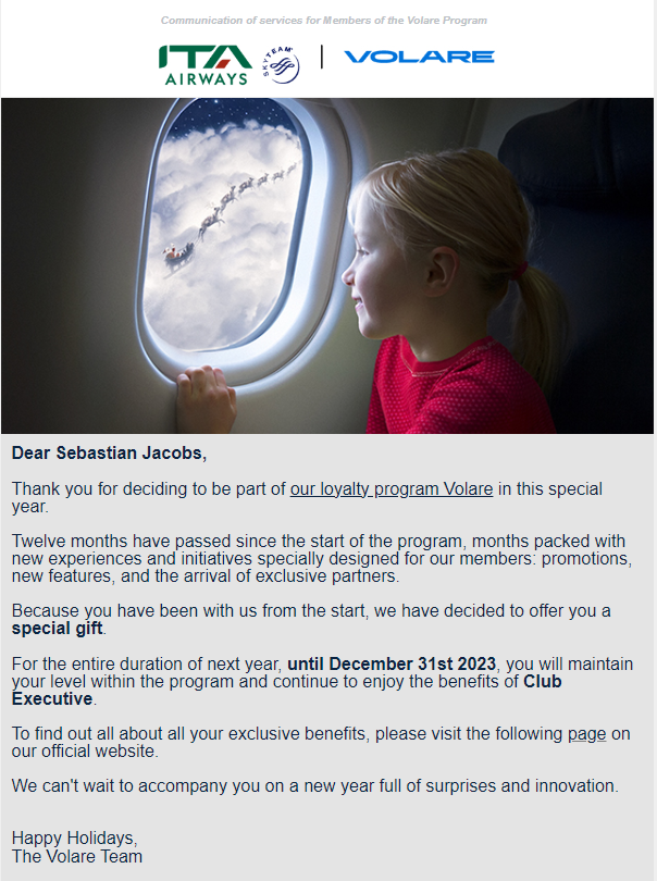 Auch aus Italien gibt es zum Jahresende nochmals eine gute Nachricht. Mitglieder des Volare-Programms von ITA Airways sollten in den vergangenen Tagen eine E-Mail mit der (etwas anderen) frohen Botschaft erhalten haben:
