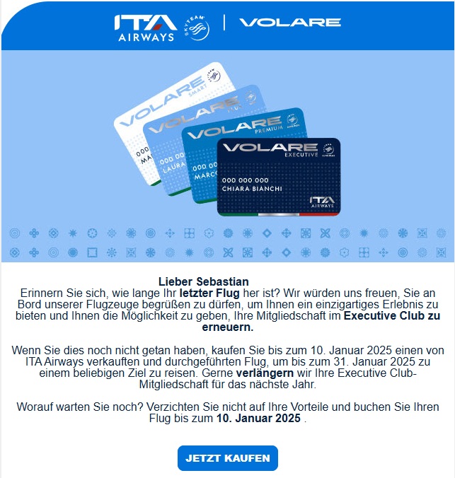 Daher wird Volare auch bis ins Jahr 2025 hinein noch fortgeführt. Aber was passiert mit den vielen Elite-Mitgliedern, die sich nicht erneut für den Status qualifiziert haben? Die müssen nicht leer ausgehen, wie eine aktuelle Promotion-Mail an die betroffenen Vielflieger zeigt. Volare verspricht den Empfängern der Mail, dass der bisher erlangte Volare-Status auch über Januar 2025 hinaus verlängert wird, wenn man bis zum 31. Januar 2025 mindestens einmal mit ITA fliegt. Die Buchung des Fluges muss bis spätestens 10. Januar 2025 erfolgen.