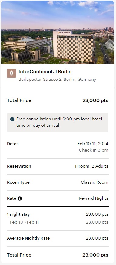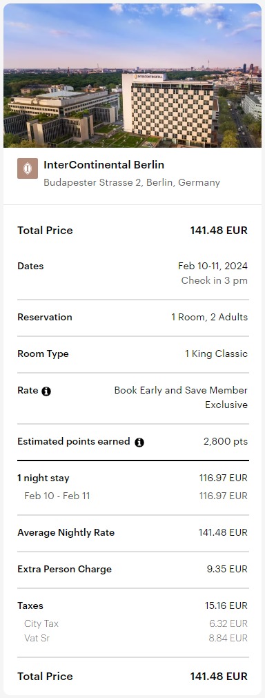 Ein konkreter Fall, bei dem wir die günstigste Rate im InterContinental Berlin mit einer Punktebuchung vergleichen: