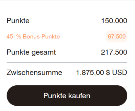 Durch diese Aktion kauft Ihr im Idealfall Punkte zum Preis von 0,86 USD-Cent. Ein kleiner Wermutstropfen ist derzeit die Abrechnung in USD, denn die sind im Tausch zum Euro derzeit echt stark und damit müsst Ihr tiefer in die Euro-Geldbörse greifen.