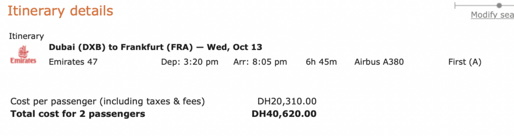 Mit 170.000 Emirates Skywards Meilen in der FlexPlus Prämie und 800 AED (ca. 185 Euro) an Steuern und Gebühren war es sicherlich kein Schnäppchen (was die Meilen angeht), aber für uns jede Meile wert.