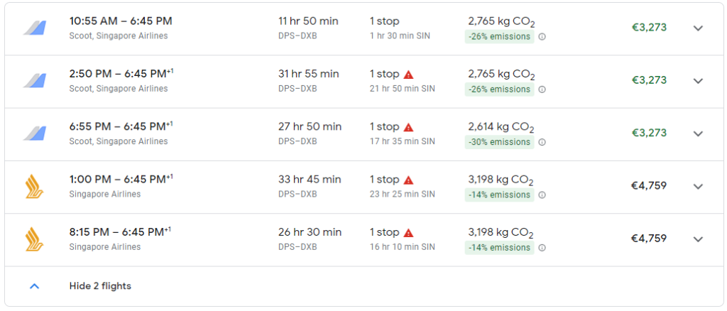 Flüge Singapore Airlines C DPS-SIN-DXB       405,00€          98.000     3.273,00€