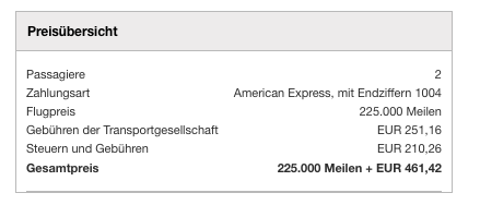 Mit 39.000 Meilen pro Person war dies nicht der aller beste Deal, aber wir wollten uns etwas gönnen und am Ende habe ich es auch nicht bereut, denn die Meilen waren da.