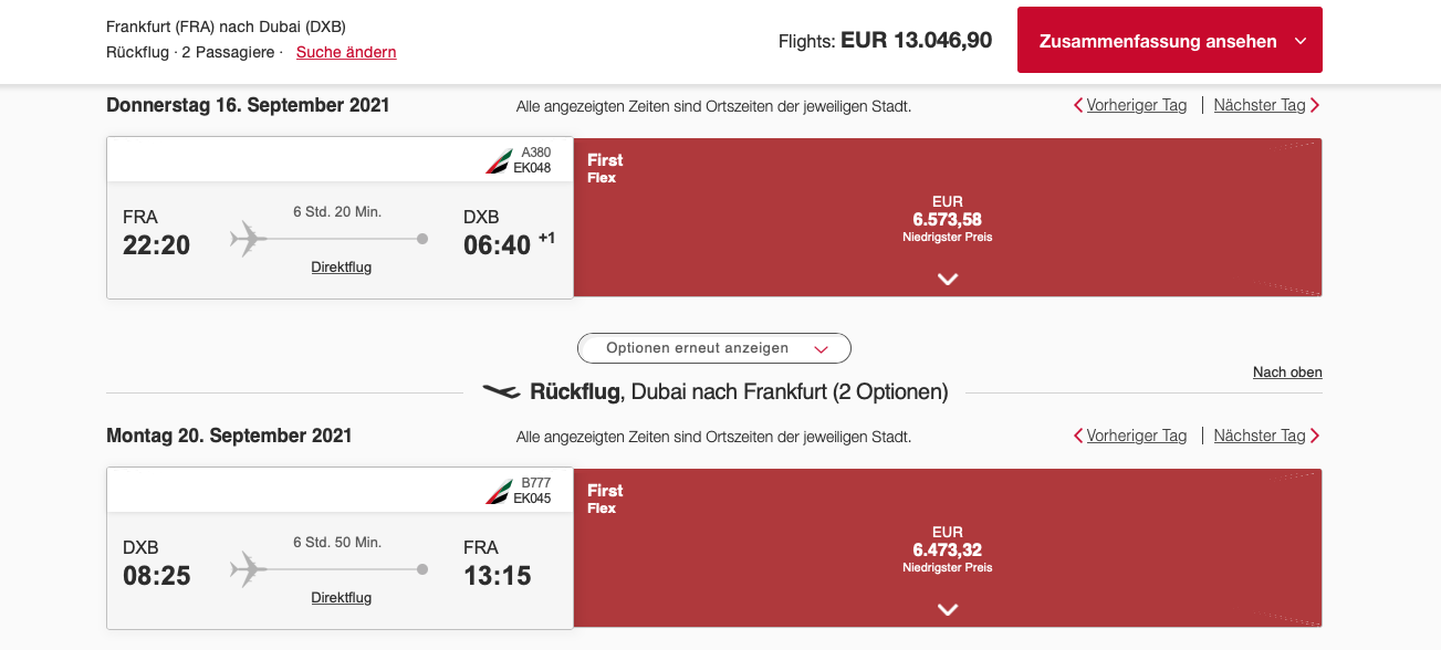 Hierbei handelt es sich übrigens nicht um den höchsten verfügbaren Preis, sondern die günstigsten verfügbaren First Class Tickets im First Flex Tarif. Hätte ich den First Flex Plus Tarif gewählt, würden die Flüge über 15.000 Euro für zwei Personen kosten. Und JA! das sind normale Preise für First Class Flüge, wenn man keine Sonderangebot bekommt.