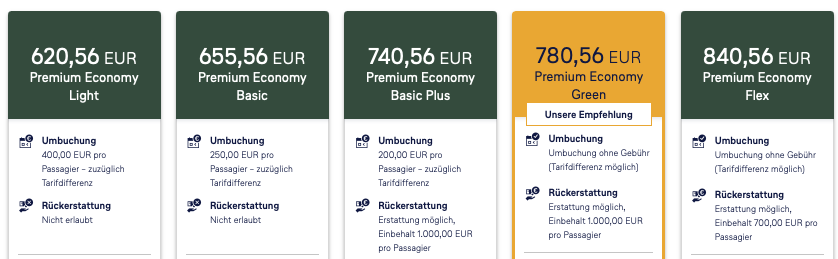 In der Premium Economy Class hat die Lufthansa Group auf diesen Strecken nun folgende Struktur für Stornos: