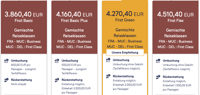 Beispiel für einen Flug von Frankfurt nach Delhi in der First Class.