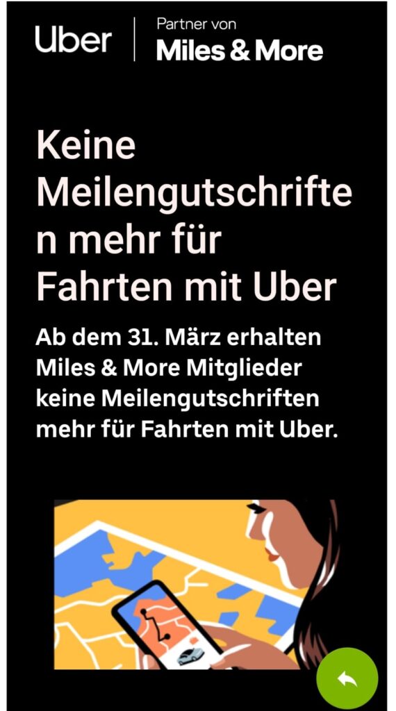 So passiert das jetzt auch mit Uber. Ab dem 1. April 2024 gibt es keine Miles & More-Meilen mehr, wenn Ihr Eure Taxifahrt mit Uber bucht.