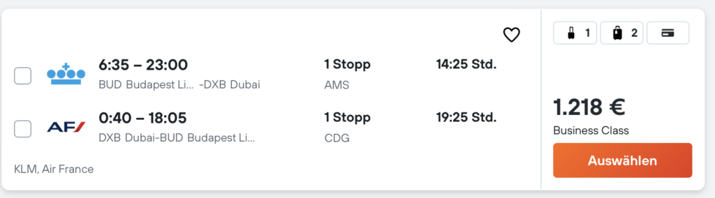 Wer gerne in der bequemen Business Class nach Dubai reisen will, der kann mit den KLM und Air France Business Class Angeboten ab Budapest nach Dubai profitieren, welche sich ab 1.218 Euro für den Hin- und Rückflug buchen lassen. Auch wenn man hierfür noch zwingend eine Anreise nach Ungarn mit einplanen muss, sind dies extrem attraktive Preise.