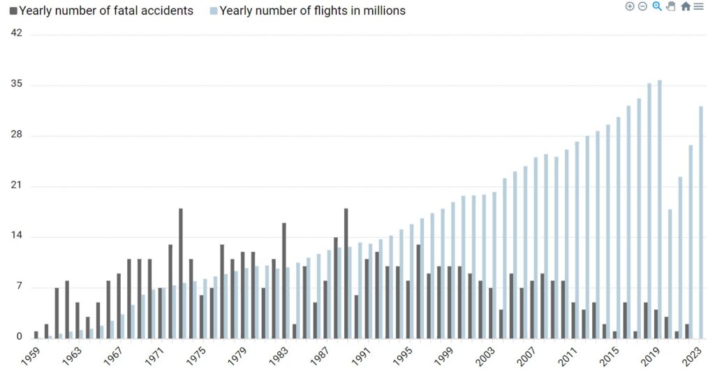 Airbus führt diese Statistik über tödliche Flugzeugunfälle seit 1959. Im Jahr 2018 gab es einen letzten Höchststand. Bei 35 Millionen Flugbewegungen in der kommerziellen Luftfahrt kam es zu fünf Flugzeugunglücken mit Todesfolge. Im Vergleich zu den 1970er und 1980er Jahren, in denen es teilweise bis zu 18 tödliche Flugzeugunfälle gab, konnte das Fliegen jedoch auch schon 2018 als sehr sicher bewertet werden. Danach kamen die Covid-19-Jahre und die Anzahl der Flüge ging zurück. Trotzdem ereigneten sich immer wieder einzelne Flugzeugabstürze und Unfälle mit Todesfolge. Der Trend ist jedoch klar: Das Risiko bei einem Flugzeugabsturz oder -unfall ums Leben zu kommen, wird immer geringer.
