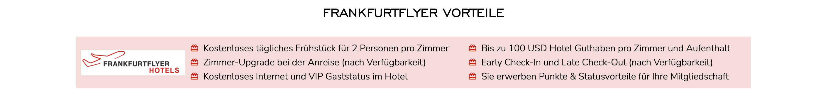 Das Vorteilspaket hat schnell einen Gegenwert von mehreren Hundert Euro pro Aufenthalt und umfasst in der Regel Dinge wie Frühstück, Upgrades, Hotelguthaben und vieles mehr. Die Vorteile unterscheiden sich leicht von Hotel zu Hotel und Ihr könnt sie im Detail nach dem Login in unserem Buchungsportal einsehen. Natürlich können wir Euch aber auch immer persönlich beraten und über die genauen Vorteile informieren.
