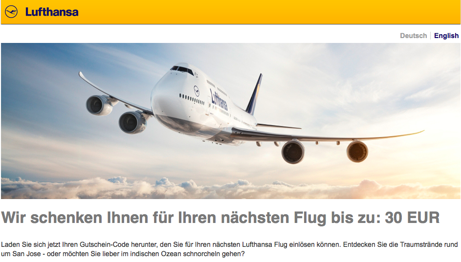 Um den kostelosen 30 Euro Lufthansa Gutschein zu erhallten müsst Ihr nur Euren Namen und Email Adresse auf der Lufthansa Gutscheinseite eintragen. Der Lufthansa Gutschein kommt anschließend per Email.