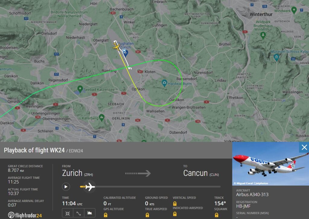 Was war passiert? Die Schweizer Ferienfluggesellschaft Edelweiss führt derzeit regelmäßig Flüge vom Flughafen Zürich (ZRH) nach Cancún (CUN) durch. Eingesetzt wird auf den Flügen in die Karibik in der Regel ein vierstrahliger Airbus A340-300. So auch am Samstag, den 6. April 2024, als der A340 mit der Registrierung HB-JMF den Flug durchführen sollte.