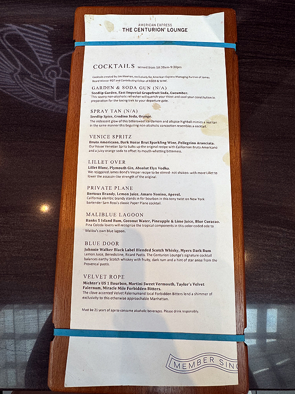 Centurion Lounges sind seit jeher für ihre Bars bekannt. Und auch die Bar in der Centurion Lounge LAX enttäuschte nicht. Die Wortspielereien in der Karte fand ich lustig und die Drinks waren lecker. Die beiden Bartender waren schnell, effizient und haben die Gäste streng nach Reihenfolge bedient.