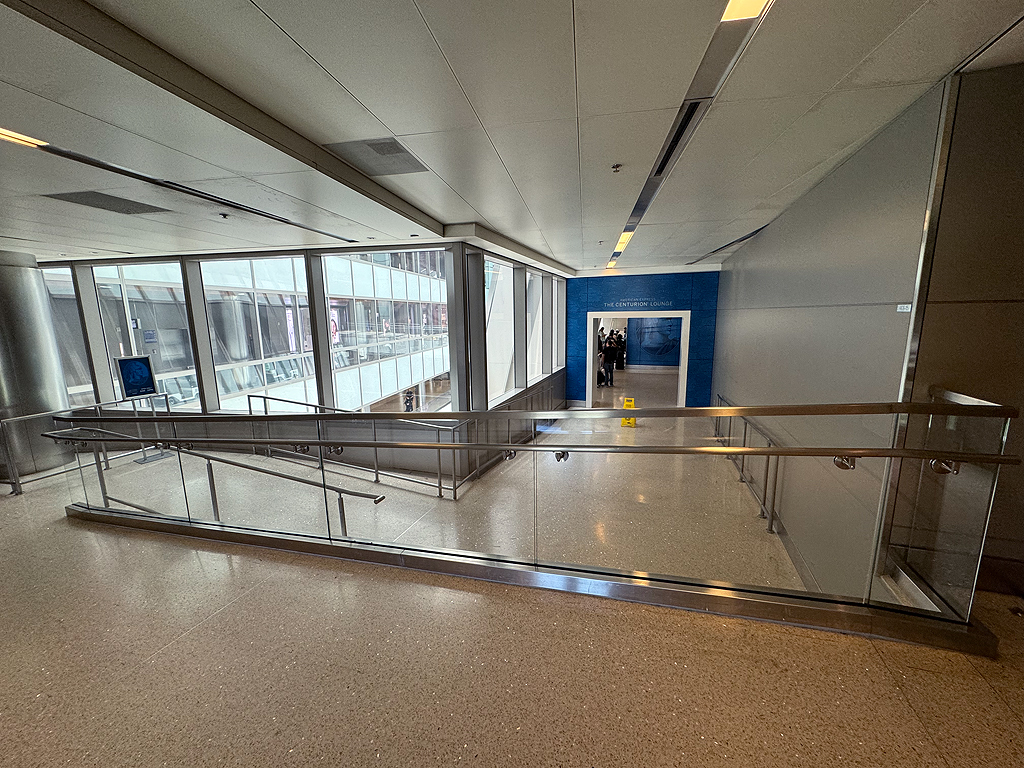 Die American Express Centurion Lounge sieht man leicht, denn das übergroße Centurion Logo prangt hoch an einer Wand gegenüber einer Fensterfront. Vielleicht habt Ihr das American Express Logo schon einmal auf dem Weg zu den Gepäckbändern gesehen. So leicht die Lage der Lounge auszumachen ist, so schwer kann es sein, den Eingang zu finden. Denn der ist eher klein und unauffällig, zumindest wenn Ihr nicht im internationalen Terminal durch die Sicherheitskontrolle geht, und praktisch direkt auf die Lounge zusteuert.