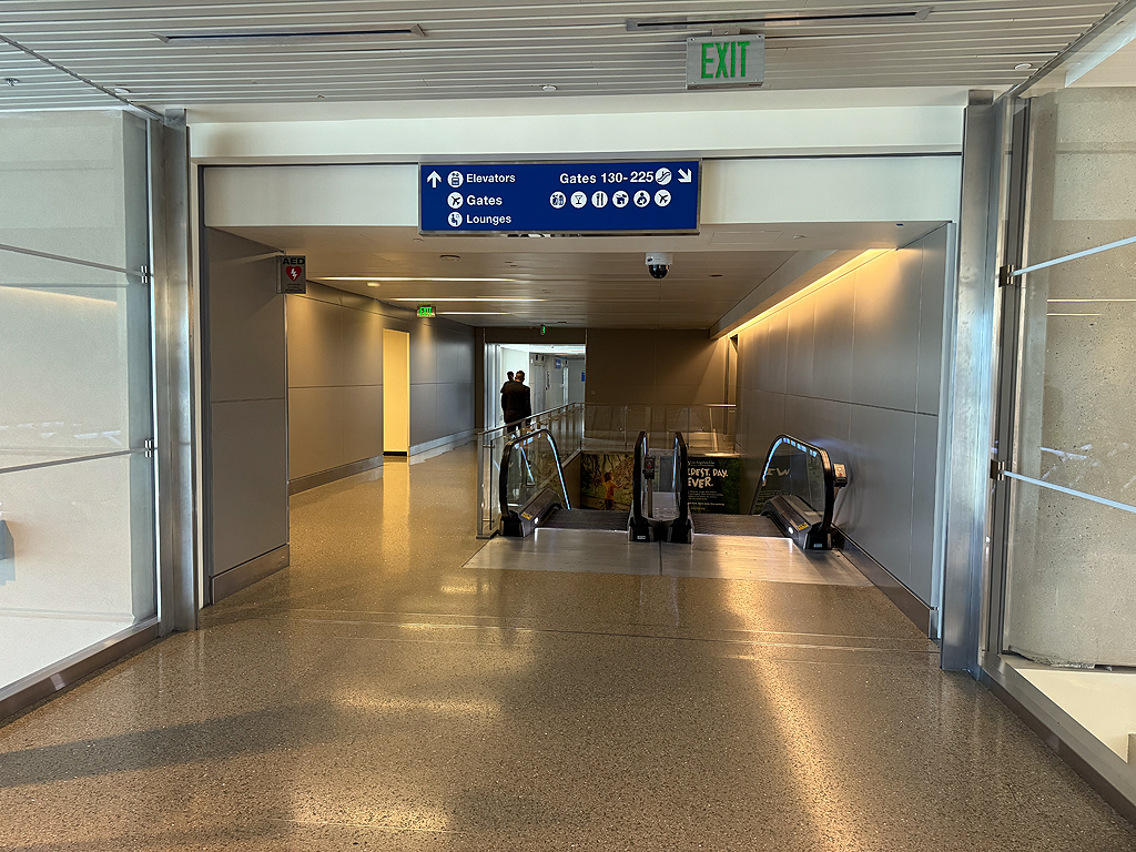 Im internationalen Terminal begebt Ihr Euch auf Ebene 4. In einem grau-in-grau Durchgang gibt es dann einen kleinen, blau gekennzeichneten Durchgang. Dort geht Ihr hinein und fahrt mit dem Aufzug von Ebene vier auf Ebene zwei. Dort steht Ihr dann direkt vor der Rezeption der Centurion Lounge.
