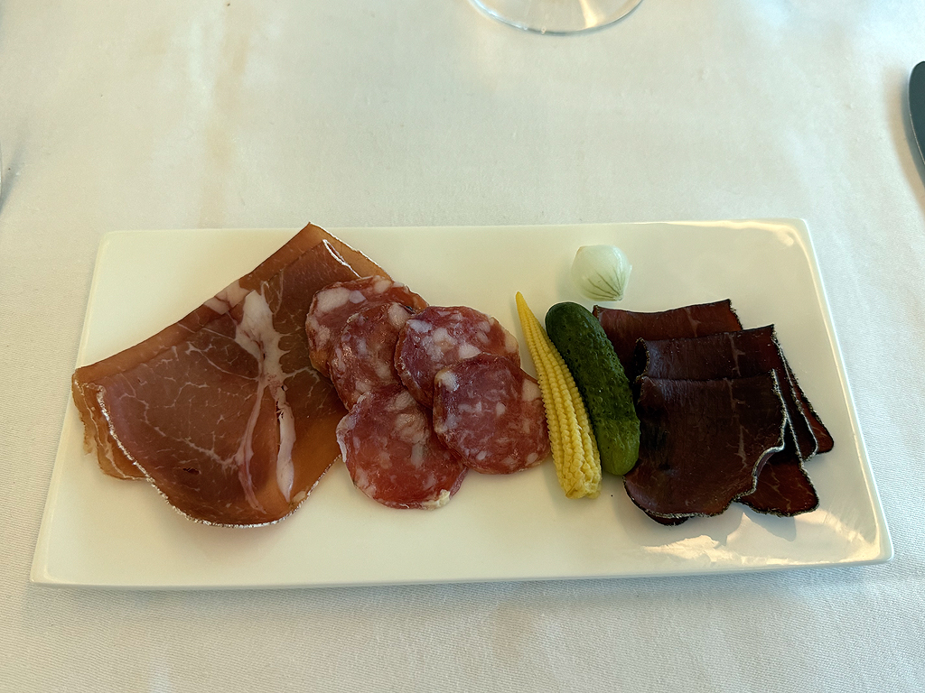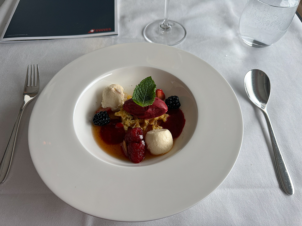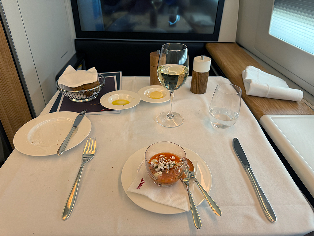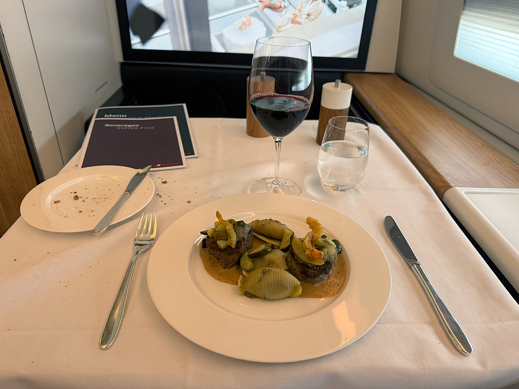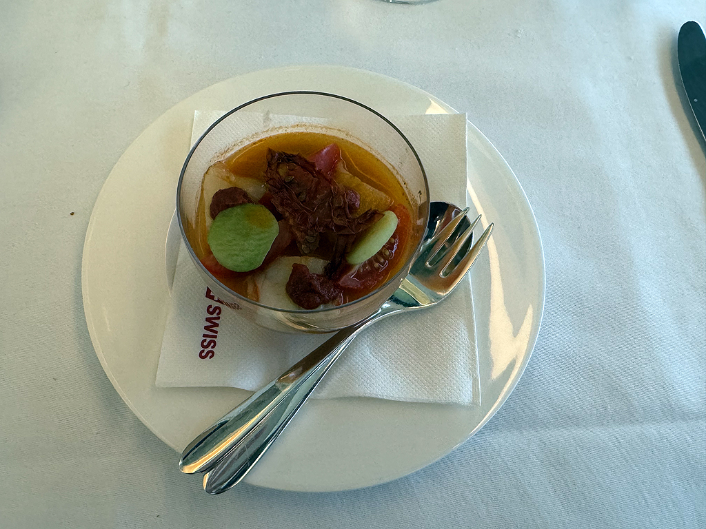 Das Catering bei Swiss hat mich überzeugt, wenngleich einige Gerichte auf der Speisekarte irgendwie das Cost-Cutting bis in die First Class Kabine brachten. Es gab eine Vorspeise mit Tomate und Scampo. Ja, richtig, Scampo ist der Singular von Scampi und so gab es in dem ganzen Glas mit Tomatenstückchen genau einen kleingehackten Scampo. Bemerkenswert.