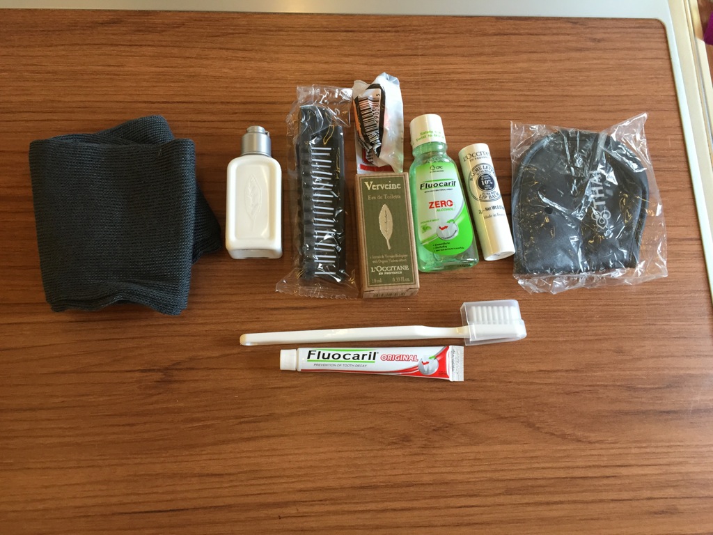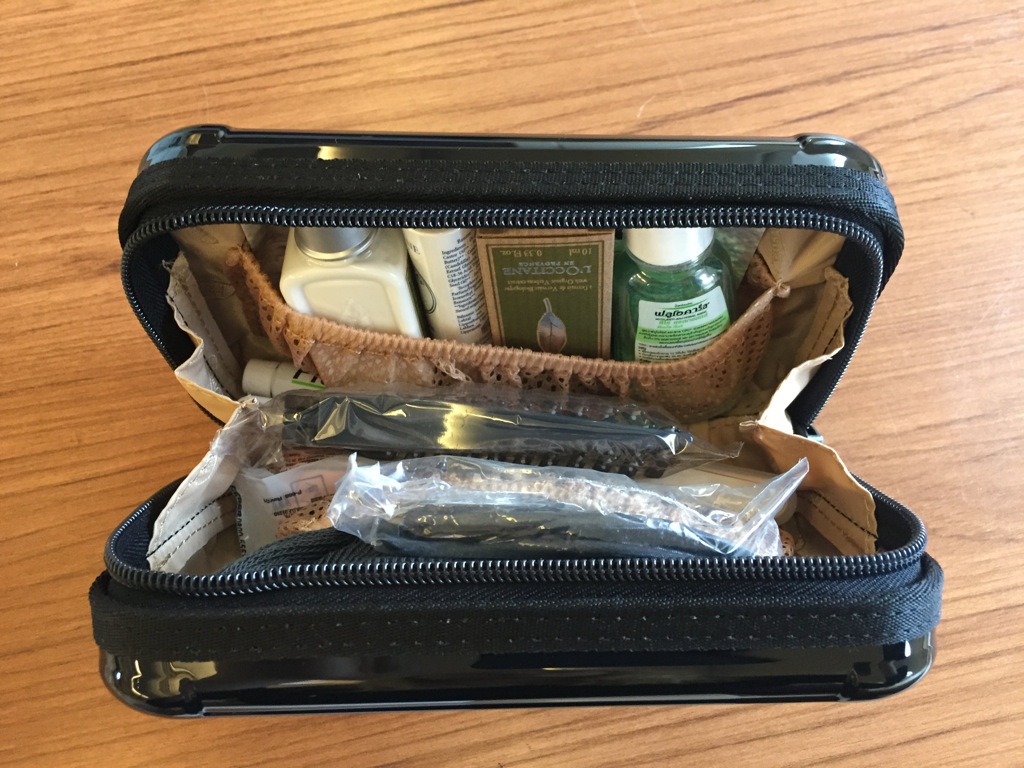Auch wurde bereits am Boden das Amenity Kit verteilt. Ich freute mich sehr, dass es ein kleines Rimowa Kit mit recht umfangreichem Inhalt gab.