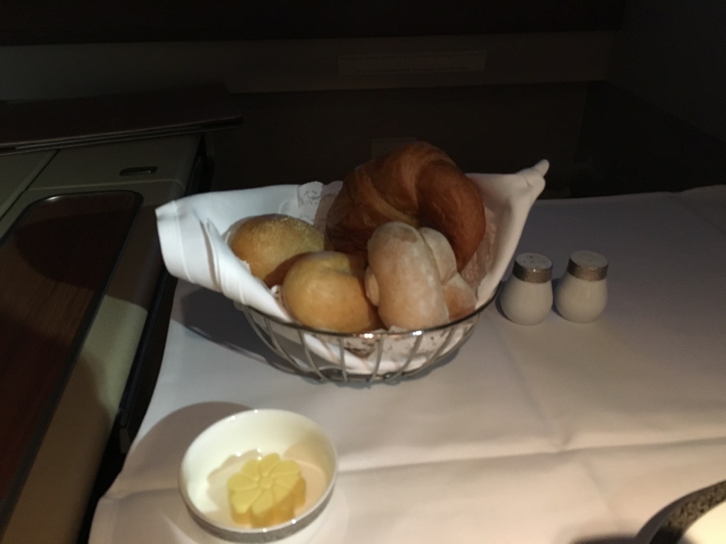Normalerweise würde ich auf solch einem kurzen Nachtflug nur versuchen zu schlafen. Nachdem meine innere Uhr allerdings in einer völlig anderen Zeitzone war und ich auf dem Flug von Brisbane nach Bangkok wie ein Baby geschlafen hatte, habe ich noch etwa eine Stunde gearbeitet. Nachdem man mir meinen Gin&Tonic nochmals nachgefüllt hatte bin ich für ein kurzes Nickerchen auf 2K umgezogen, wo man mir bereits das Bett gemacht hatte. Obwohl ich anfänglich kaum müde war, konnte ich für fast zwei Stunden schlafen. Hier habe ich auch wieder einmal festgestellt, dass man durchaus einen deutlichen Unterschied zwischen einem Business Class Sitz und einem First Class Sitz beim Schlafen merkt. Der Schlafkompfort in der First Class ist nochmal um ein vielfaches höher.