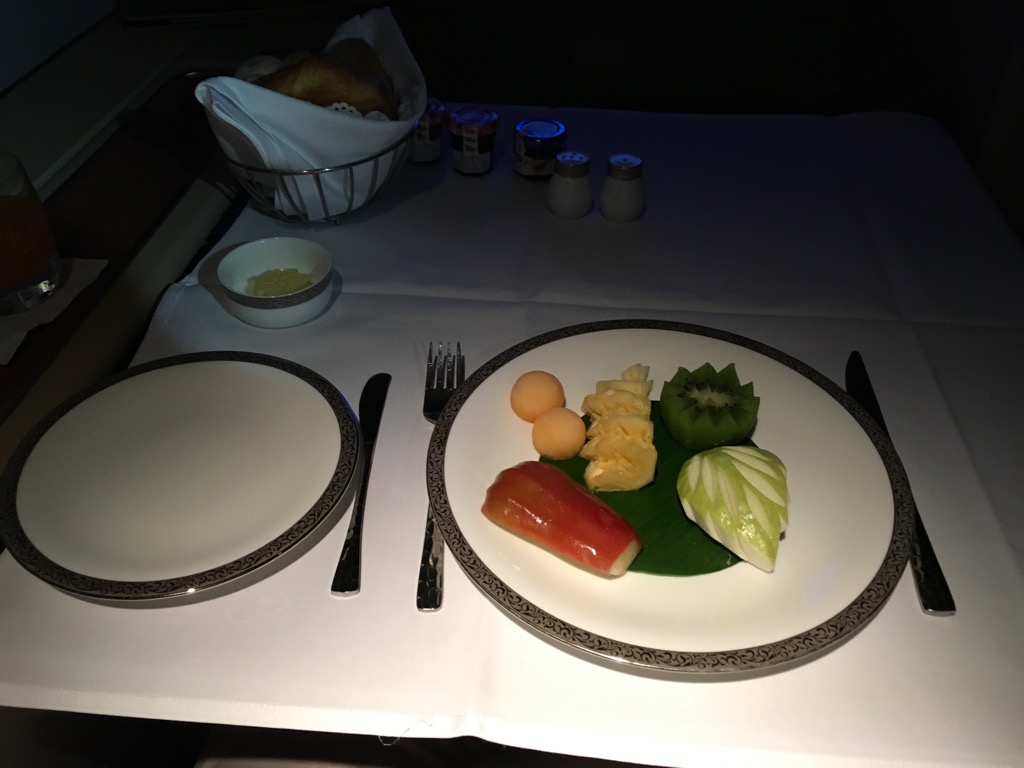 1:10 Stunden vor der Landung in Seoul bin ich aufgewacht. Man fragte mich sofort, ob ich frühstücken wolle. Ich habe mich für das westliche Frühstück entschieden. Als Vorspeise wurde ein Obstteller serviert, sowie ein reichhaltiger Brotkorb, samt Butter und Marmeladen.