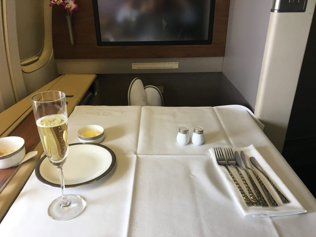 Ich habe mich für 2A, also den Fensterplatz in der zweiten Reihe entschieden. Dieser Platz hat keinen direkten Nachbarn, weshalb er sehr ruhig ist. Der Sitz selbst ist angenehm breit und verfügt über einen Ottomanen, auf welchem auch einen zweite Person während des Fluges Platz nehmen kann. Dazu passend gibt es hier einen sehr großen Tisch, an welchem auch problemlos zwei Personen essen könne. Am Tisch erkennt man auch, dass der Thai First Class Sitz in der Boeing 747 technisch das selbe Model, wie der Swiss First Class Sitz im Airbus A330 ist.