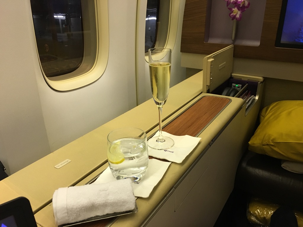Kaum hatte ich meinen Platz eingenommen und mein Handgepäck verstaut, wurde mir ein Glass Champagner angeboten. Thai serviert in der First Class auch auf innerasiatischen Flügen Dom Perignon Vintage 2004. Das von mir hierzu bestellte Glas Wasser wurde auch prompt, zusammen mit einem kalten Tuch, geliefert.
