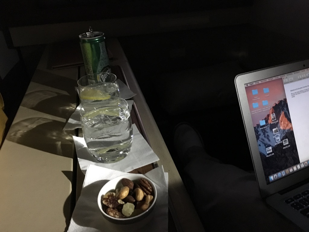 Da ich in der Royal First Class Lounge bereits gegessen hatte, habe ich auf die Suppe verzichtet und nur einen Gin&Tonic bestellt. Dieser wurde zusammen mit einem Wasser und Nüssen geliefert.