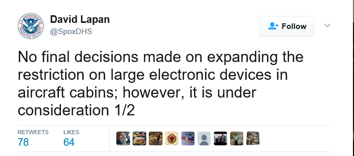 Im März wurde bereits vom Department of Homeland Security bekannt gegeben, dass zukünftig keine elektronischen Geräte mehr von bestimmten Destinationen im Mittleren Osten mit in die Kabine genommen werden dürfen.