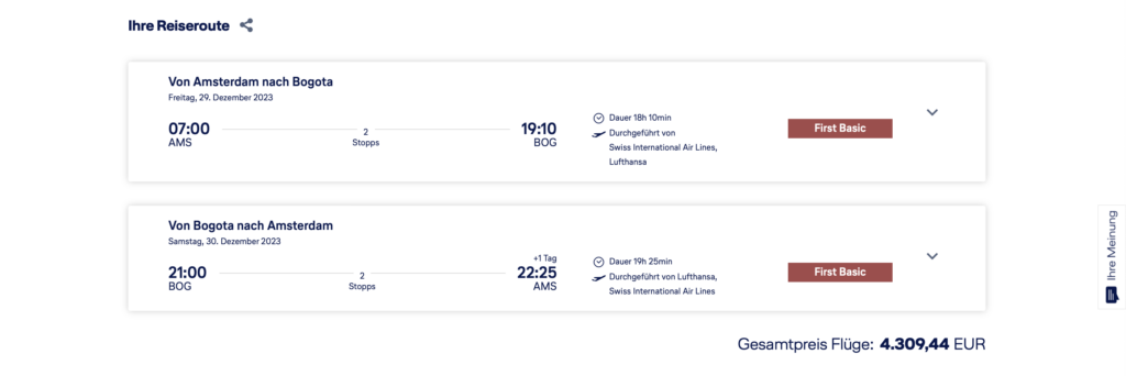 Mit etwa 4.300 Euro ist dieser Tarif alles andere als günstig, dafür bekommt man auch zwei tolle First Class Flüge. Wir haben in unserem Beispiel ein Routing von Amsterdam über Zürich und Frankfurt nach Bogota gewählt, was mit Executive Bonus immerhin 46.712 Statusmeilen produziert.