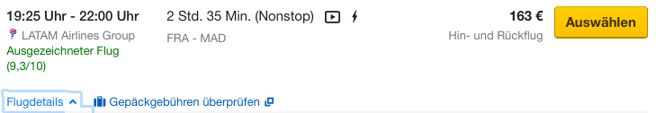 Der LATAM Flug zwischen Frankfurt und Madrid ist schon seit einiger Zeit recht bekannt, da man selten so bequem und günstig in einer internationalen Business Class fliegen kann. Mit 163 Euro für den Hin- und Rückflug bietet LATAM nun aber wirkliche Kampfpreise, bei denen es sich sogar lohnt nur für das Erlebnis LATAM Business Class einmal einen Ausflug nach Madrid zu fliegen. Ein Wochenende in Madrid ist im Spätsommer übrigens wirklich zu empfehlen.