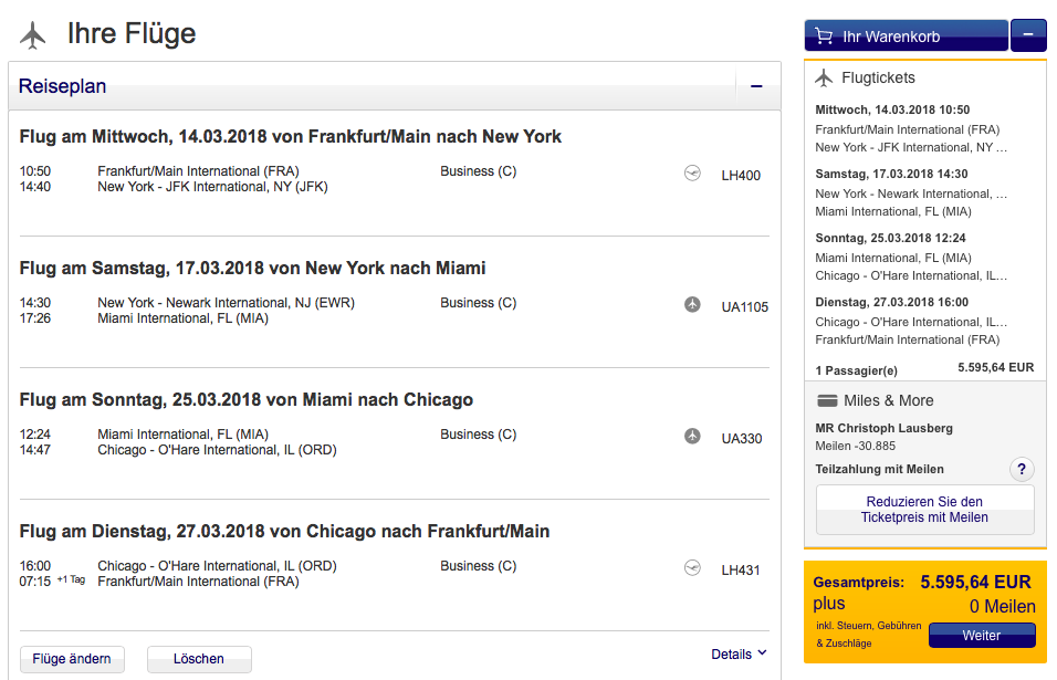 Dieses komplizierte Routing kostet bei Lufthansa 5.596 Euro, was auch insbesondere an den Stop over liegt. Dennoch sieht man hier das extrem hohe Sparpotenzial von Meilenflügen.