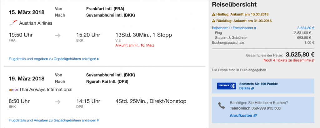 In diesem Beispiel hat man den Vorteil, dass es einen Angebotstarif gibt, welcher kostenlose Stop over erlaubt, allerdings sind diese Flüge in der Buchungsklasse P schwerer und teurer umzubuchen, als ein Meilenticket, was man mit einberechnen sollte. Dennoch ist solch ein bezahlter Flug schon doppelt so teuer, wie ein entsprechendes Meilenticket.