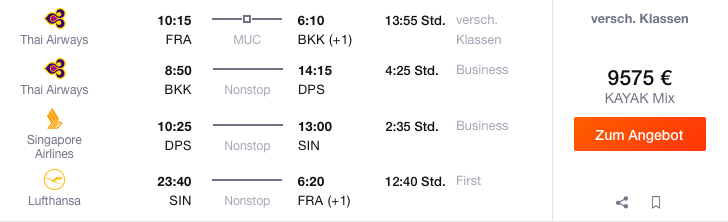 Mit fast 10.000 Euro, sind Lufthansa und ihre Partner hier auch der günstigste Anbieter. Dennoch ist man dreimal so teuer wie ein Meilenticket.