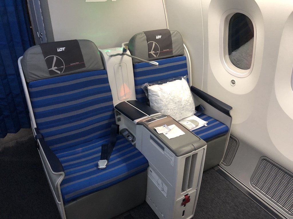 LOT hat auf ihren Boeing 787-8 eine sehr kleine und private Business Class Kabine mit nur 18 Sitzen in 3 Reihen verbaut. Dabei sind die full flat Sitze in einer 2-2-2 Anordnung verbaut.