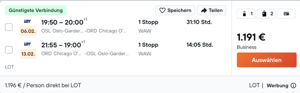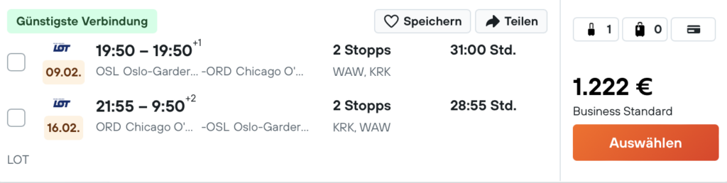 Die polnische LOT ist öfter für günstige Business Class Tickets und viele Statuspunkte gut, aber aktuell hat man einen besonders attraktiven Tarif im Angebot, denn man kann den Hin- und Rückflug nach Chicago bereits ab 1.191 Euro buchen. Das Beste dabei ist aber, dass man hier auch bis zu 560 Qualifying Points bei Miles&More einsammeln kann und so mit einer Reise schon sehr nah an den Frequent Traveller Status kommen kann, bzw. einen großen Schritt zum Senator oder HON Circle Member geht.