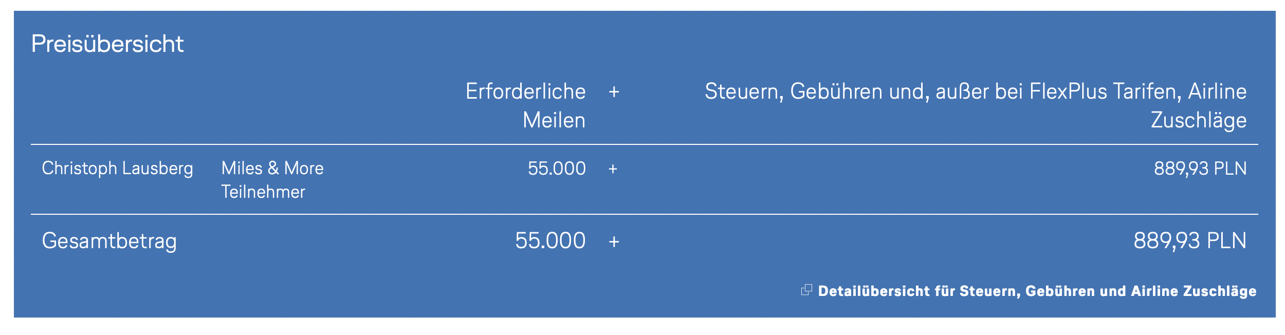 55.000 Meilen für Hin- und Rückflug, anstelle von 112.000 Meilen: